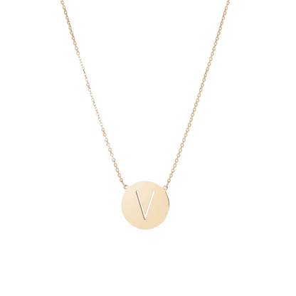 Punched letter 3/4" in size disc. Disc will be on a 18" 14K Yellow Gold cable chain.